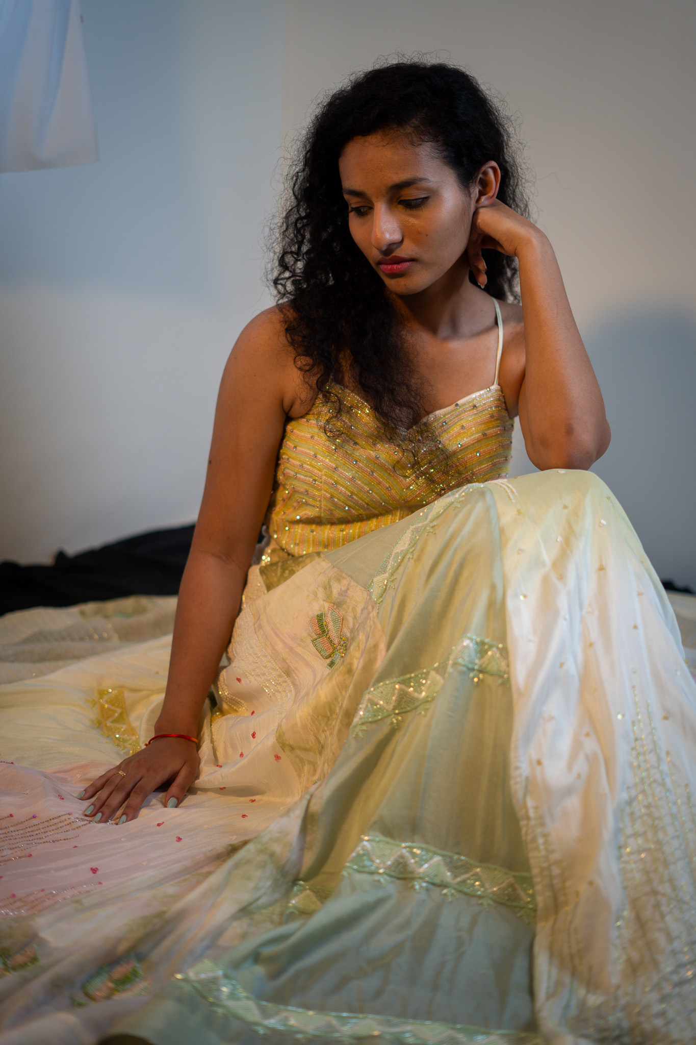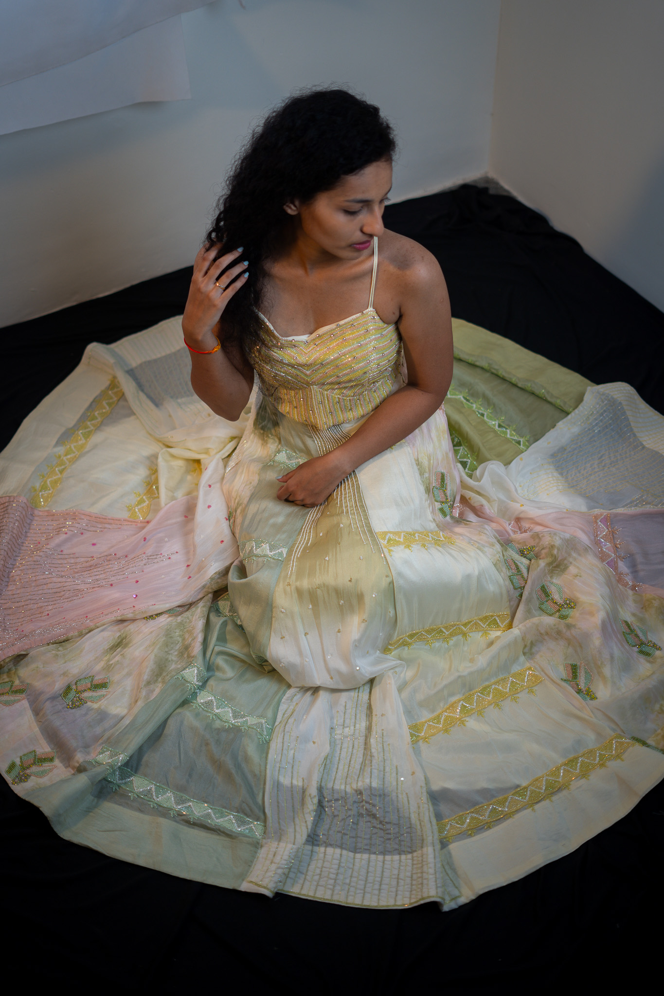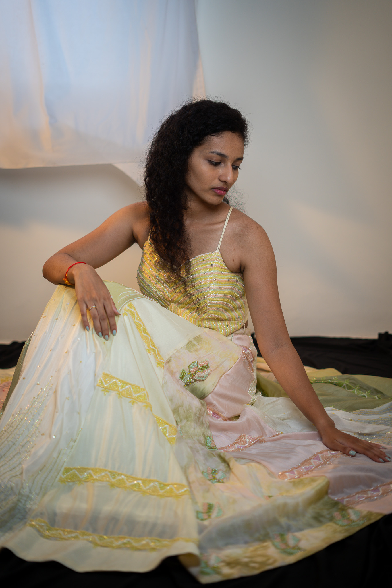 Step into grace with this handwoven pastel lehenga, designed in soothing shades of cream, yellow, and pink. Its lightweight fabric and flowing silhouette bring out a royal charm while keeping it comfortable to wear. Perfect for weddings, festive occasions, and cultural celebrations, this lehenga blends traditional craftsmanship with modern elegance.