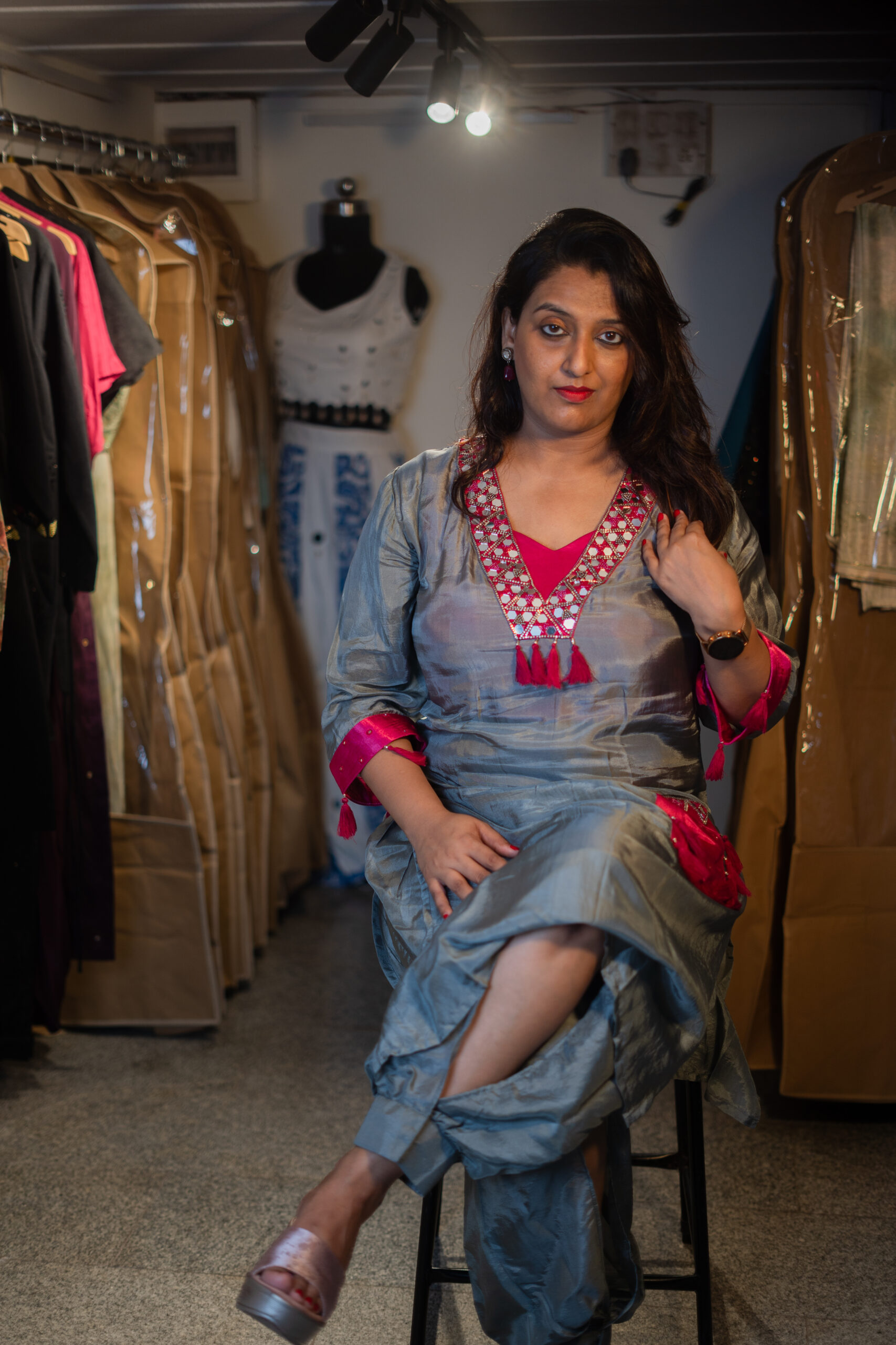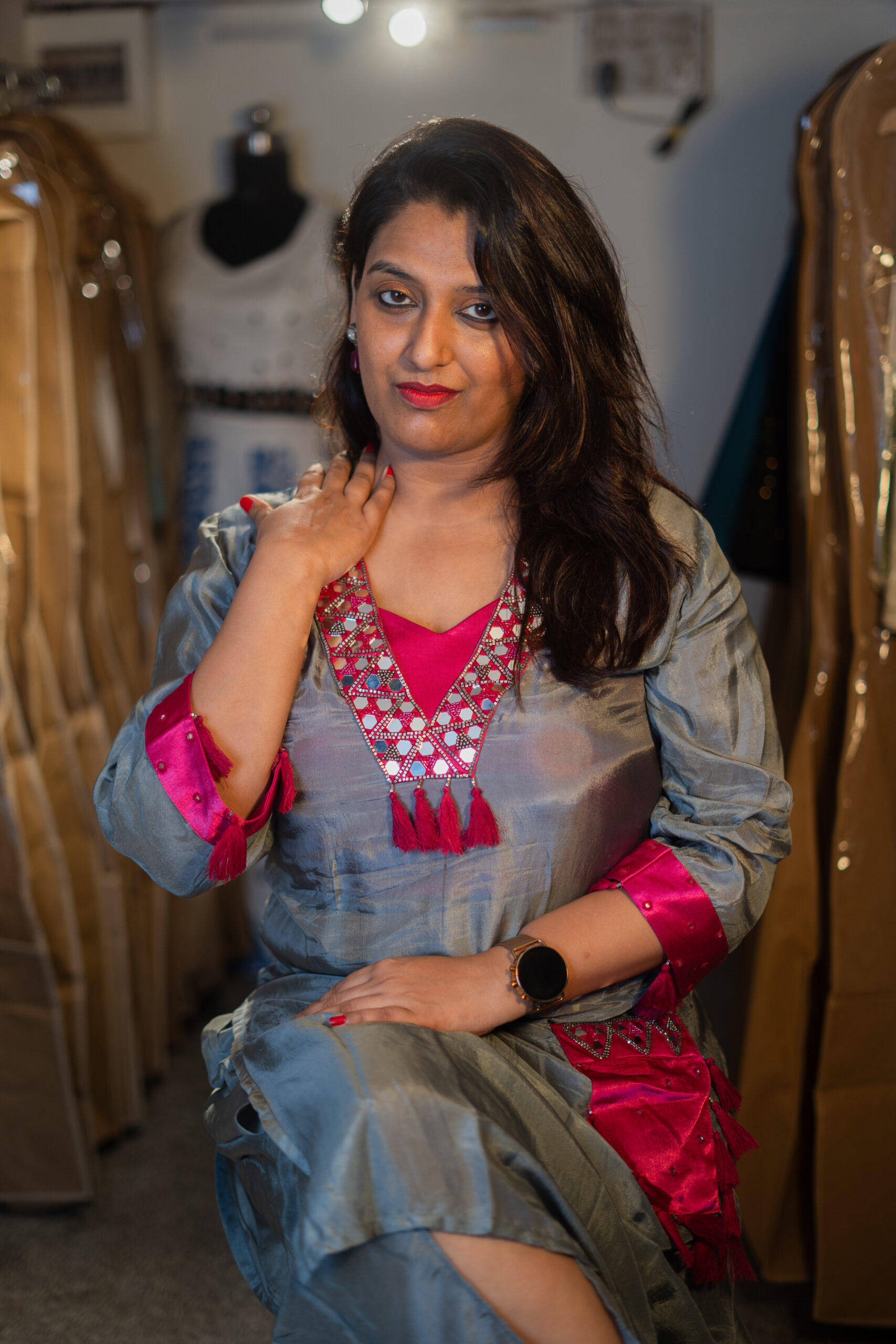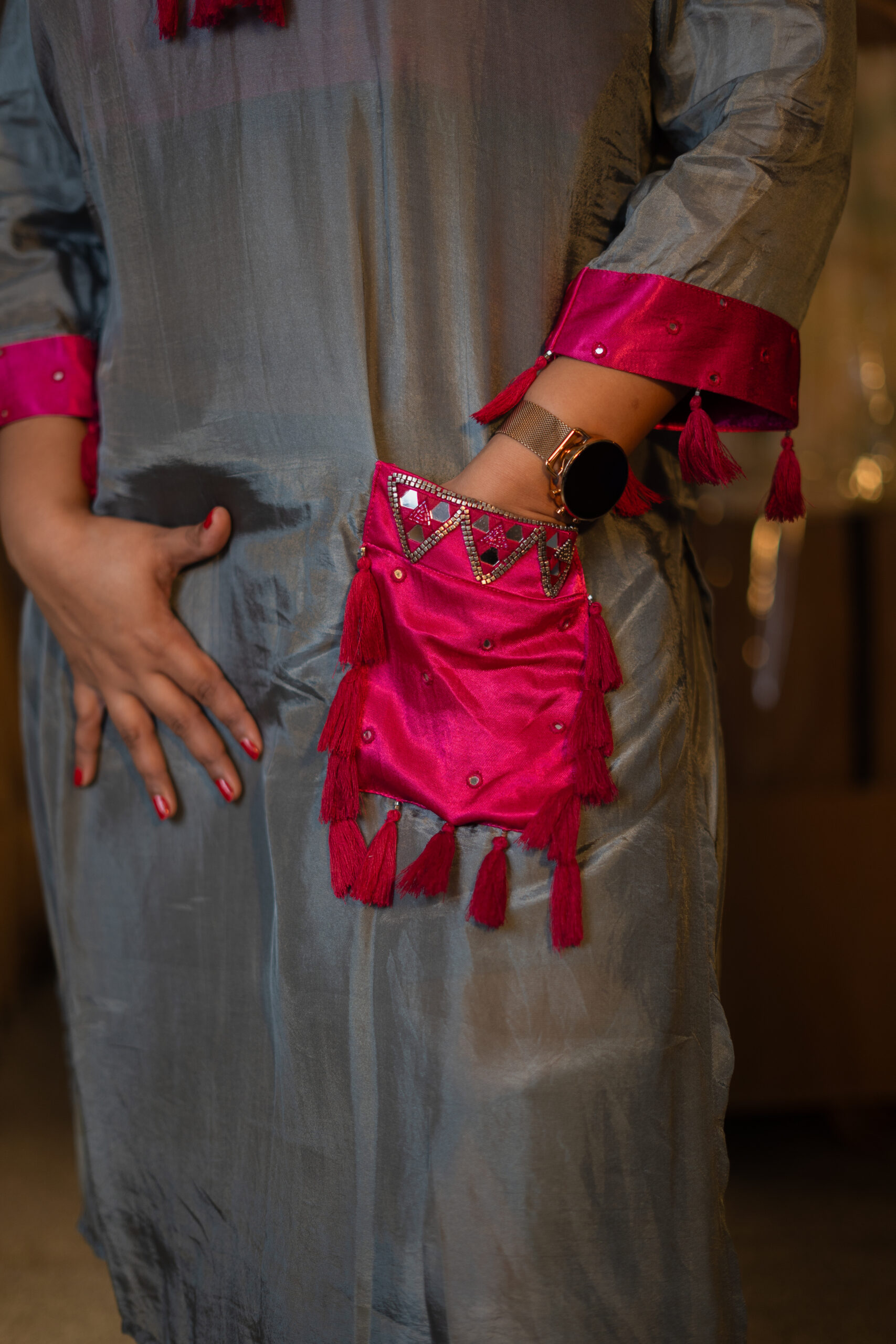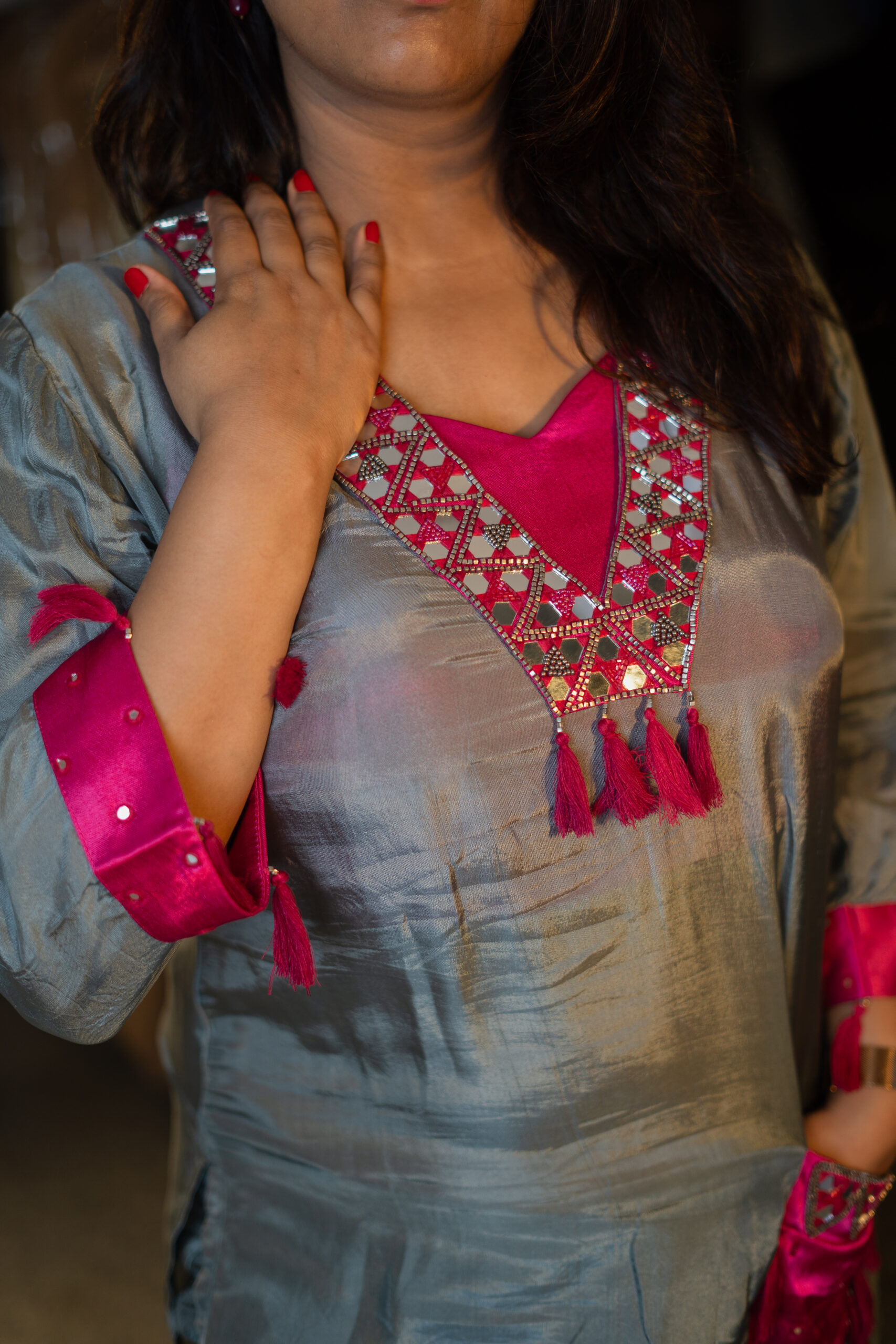 This elegant grey silk kurta set is designed for modern women who value both comfort and style. Crafted from a lustrous silk fabric, it features vibrant pink mirror-work embroidery on the neckline and cuffs, adding a festive touch. The outfit is paired with matching bottoms that have unique slit detailing, making it perfect for parties, festive occasions, or casual gatherings. Complete the look with statement earrings and heels to stand out gracefully.