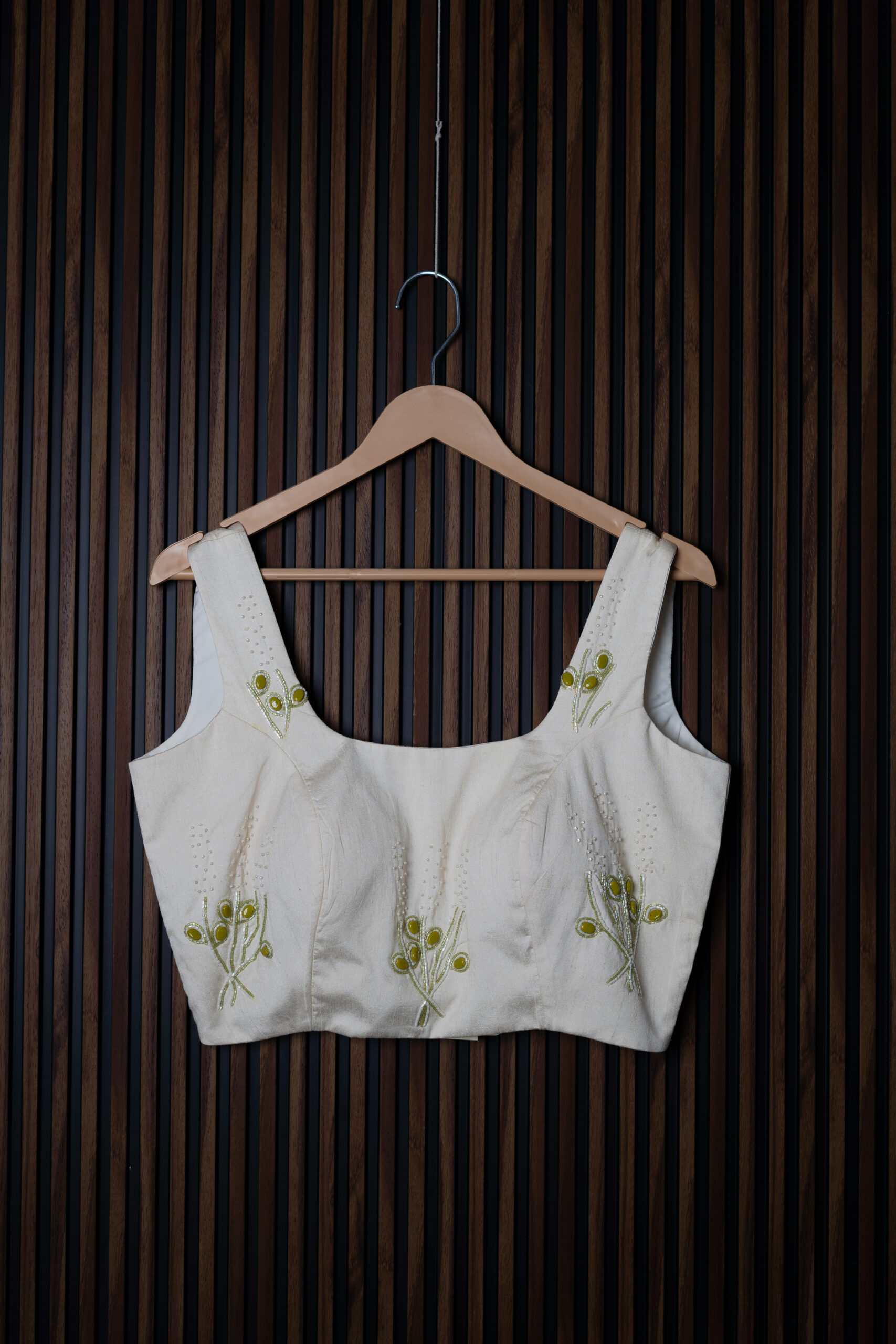 This elegant ivory blouse is adorned with delicate floral embroidery in soft green and yellow tones, adding a subtle yet charming touch. The square neckline and wide straps give it a contemporary appeal while maintaining traditional grace. Versatile and stylish, it pairs beautifully with sarees, lehengas, or skirts, making it a perfect choice for festive occasions, weddings, or casual ethnic gatherings.