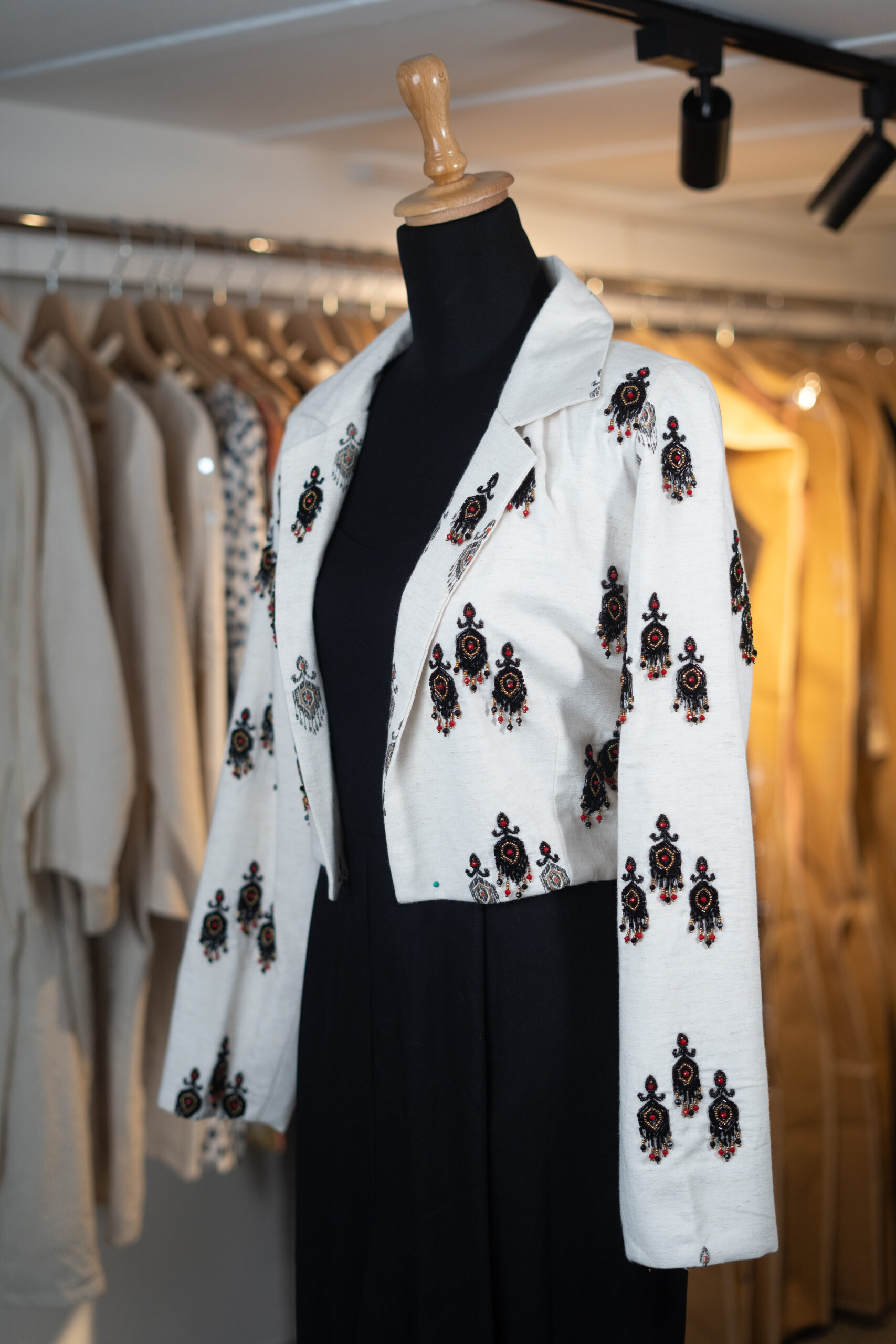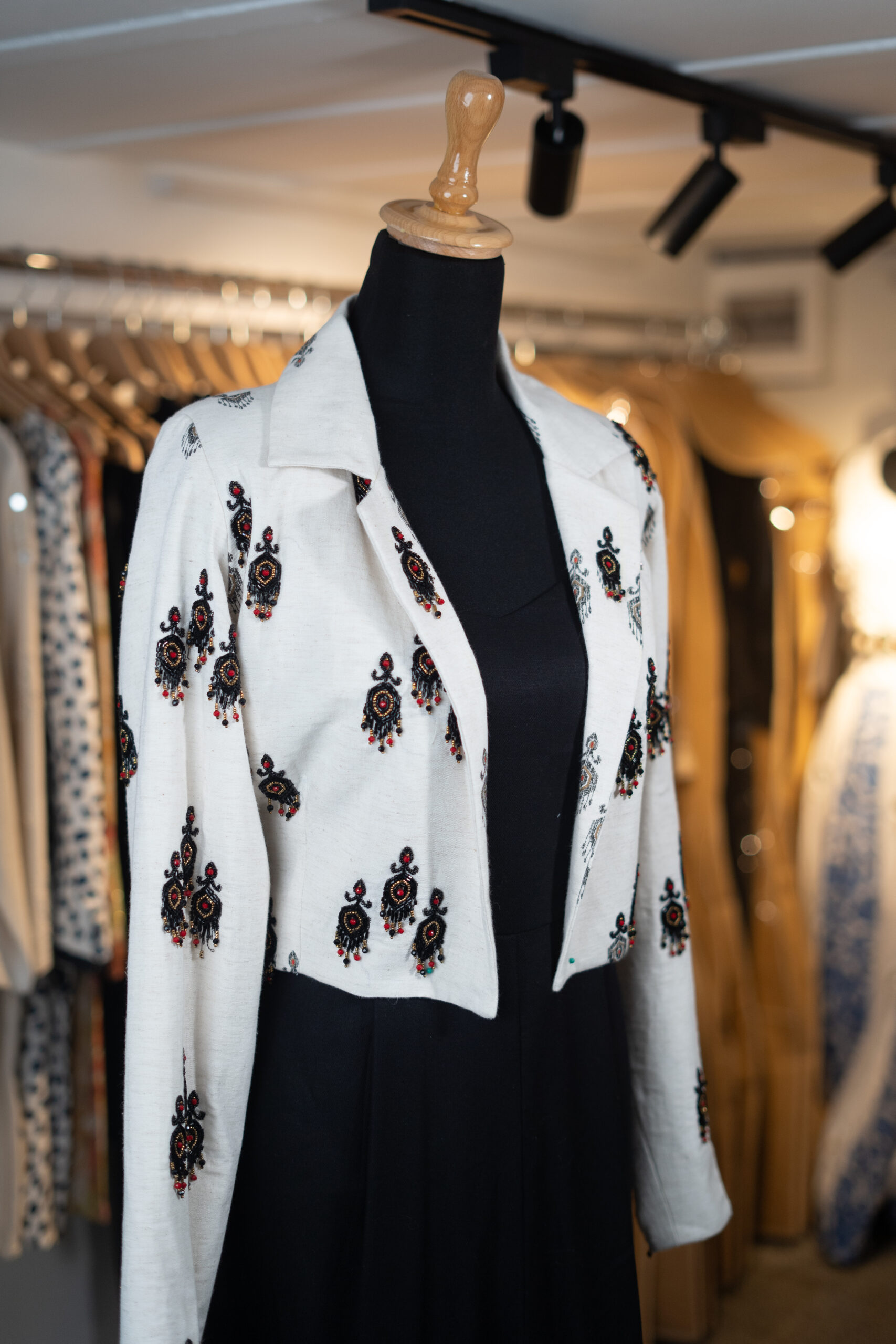 This chic black jumpsuit paired with a white cropped jacket featuring bold black motifs creates a striking monochrome look. The sleek silhouette of the jumpsuit adds sophistication, while the patterned jacket gives it a modern, stylish edge. Perfect for formal dinners, parties, or evening outings, this outfit blends comfort with contemporary fashion. A versatile piece for those who love effortless elegance.