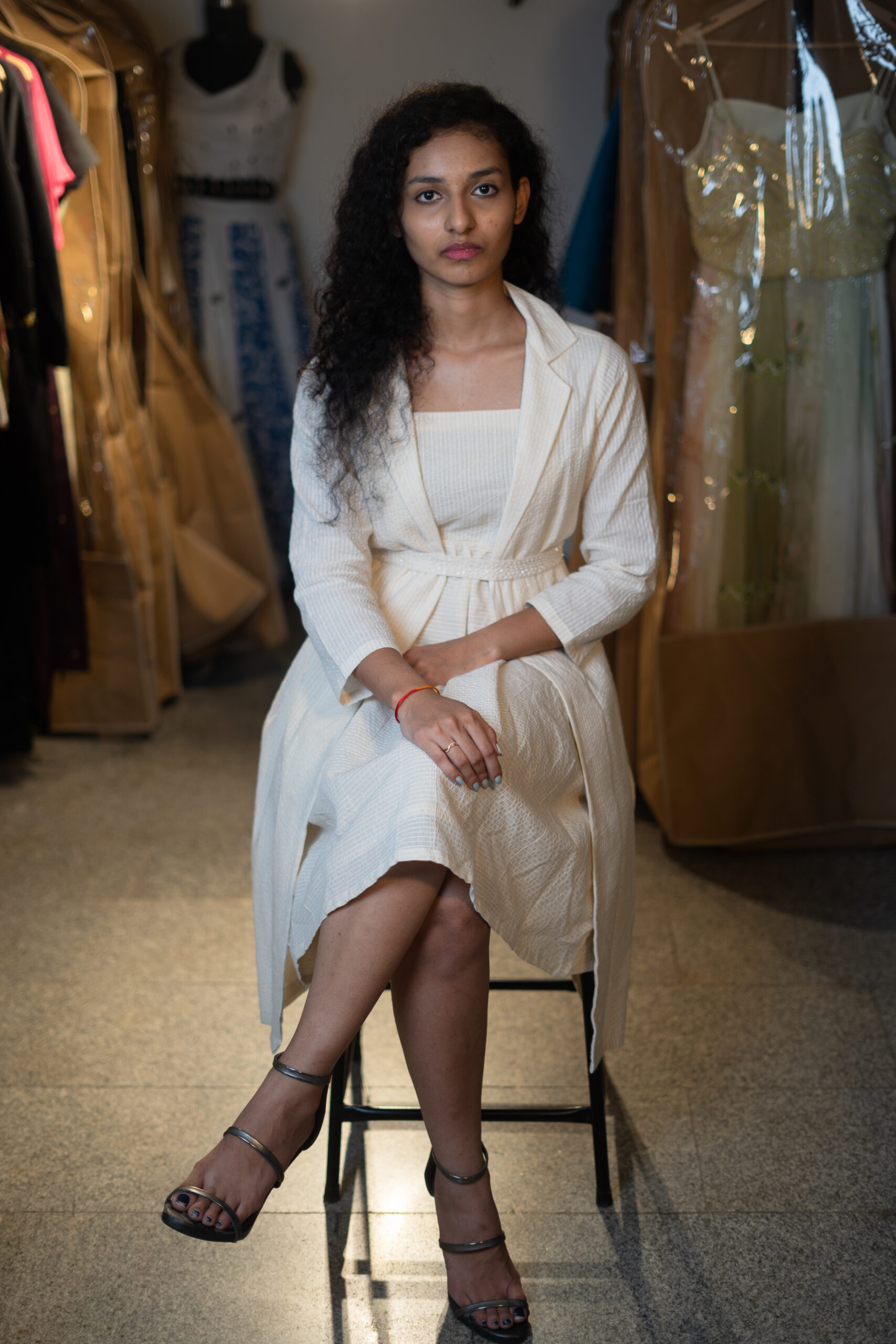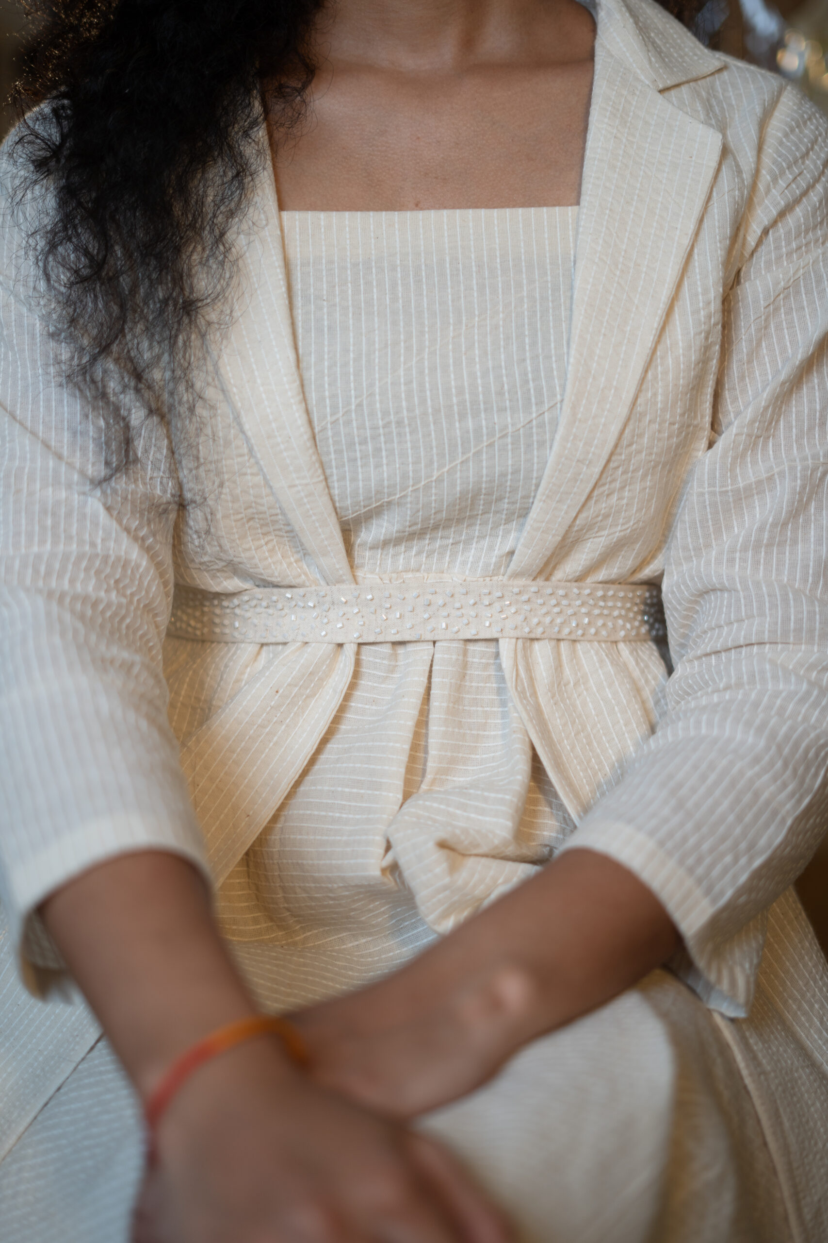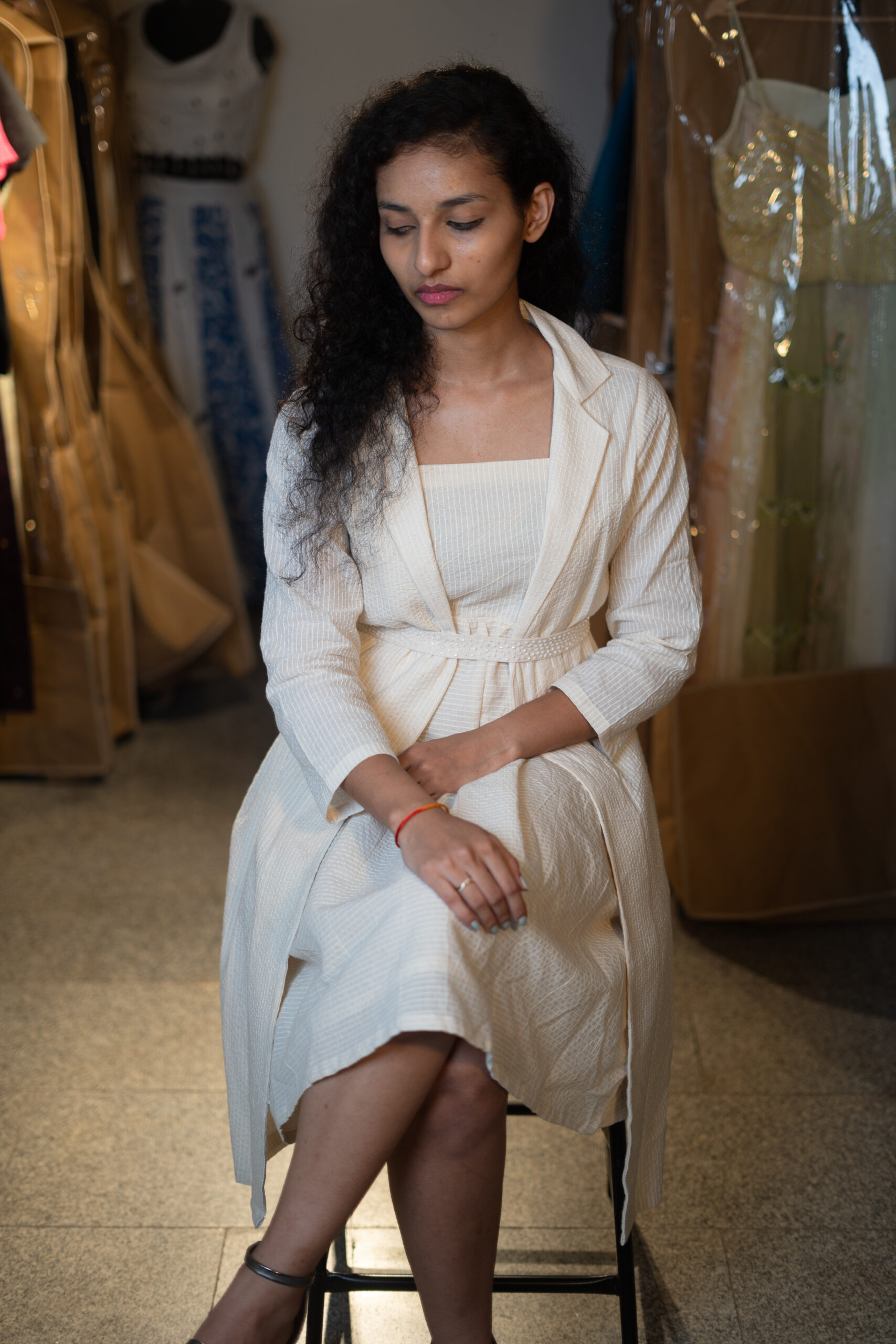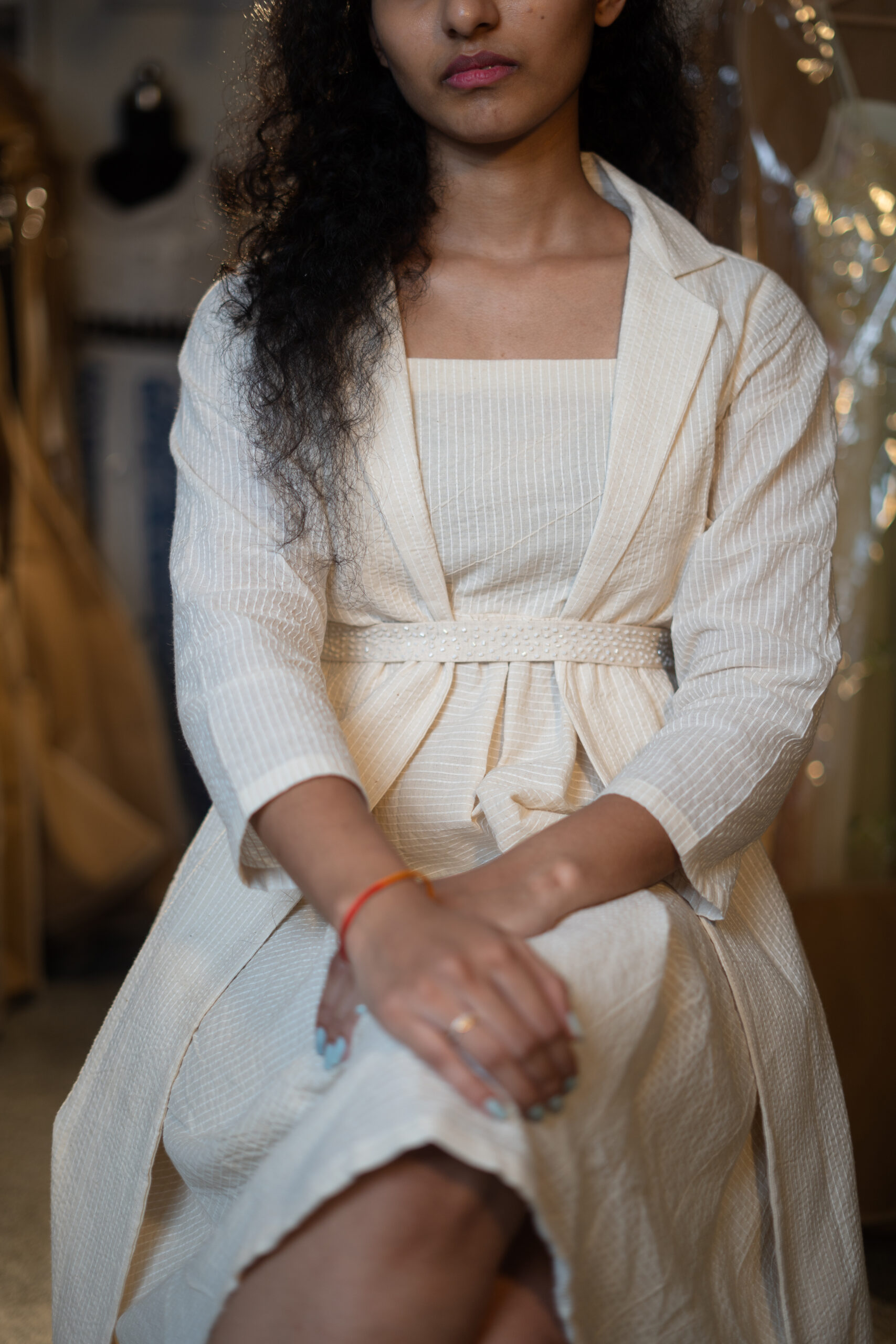 This elegant outfit features a sophisticated off-white dress paired with a long, matching overcoat-style layer, creating a chic and graceful look. Designed with a belted waist, it beautifully enhances the silhouette while keeping the style minimal yet refined. The soft fabric adds comfort, making it suitable for both casual gatherings and semi-formal occasions. Perfect for those who love timeless fashion with a touch of modern simplicity.